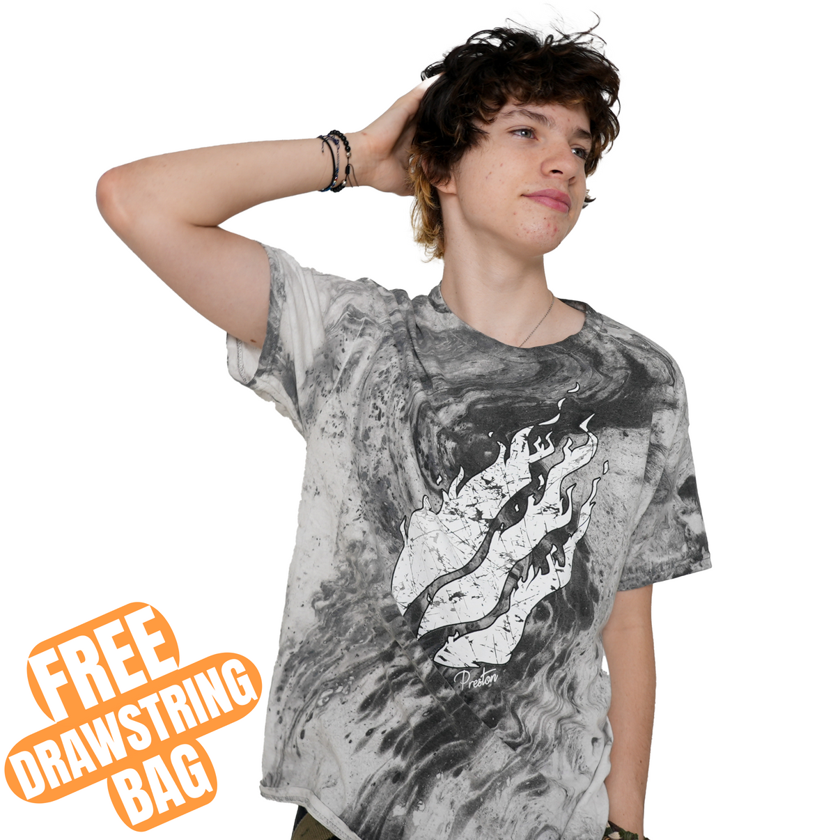 GRAY TIE DYE T-SHIRT with a distressed white flame making your FIRE fit super fresh with a vintage look.